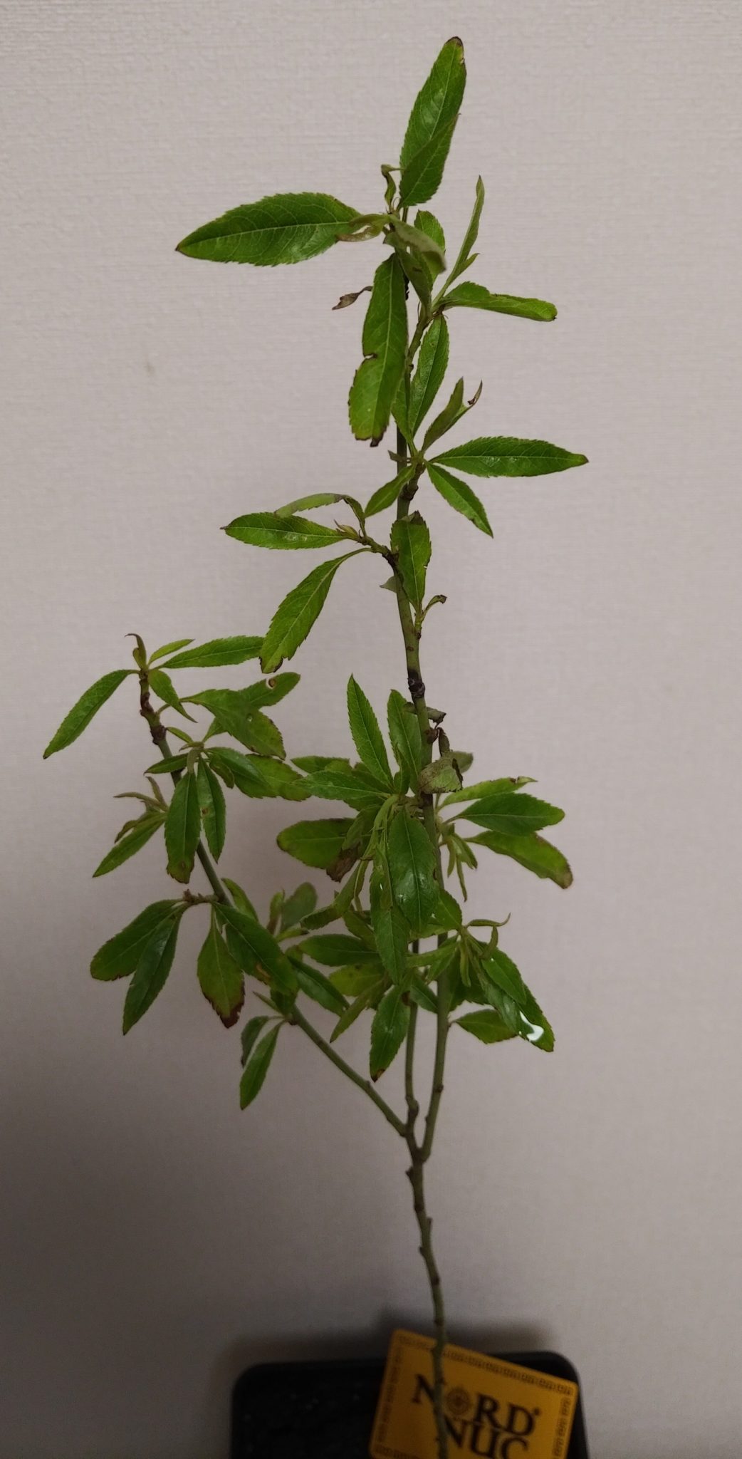Листья нередко в мутовках, яйцевидные или продолговато-яйцевидные в очертании, суженные к основанию, на конце обычно неясно трёхлопастные, от 2,5 до 6,5 см длиной и до 3 см шириной, с дважды-пильчатым краем.